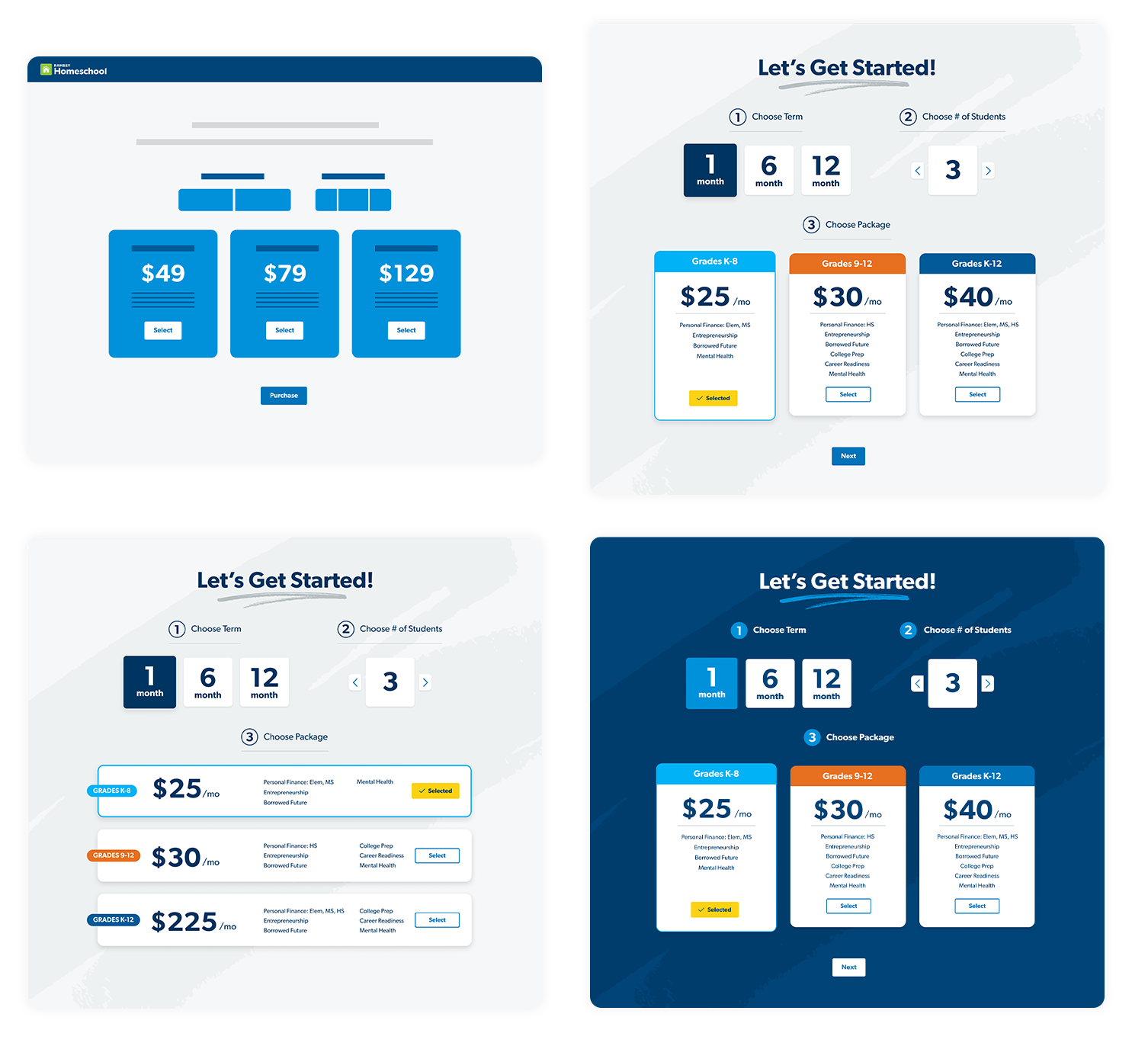 Creating an experience that accounts for a membership term, amount of students, and 3 different curriculum packages.